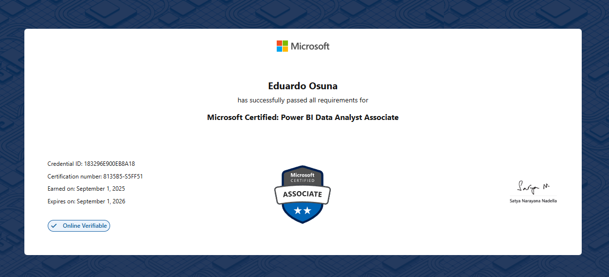 Tengo un conocimiento técnico profundo en Power BI, DAX y SQL con una capacidad excepcional para traducir datos complejos en soluciones claras, útiles y accionables. No solo construyo dashboards: diseño experiencias de información que mejoran la toma de decisiones, reducen retrabajos y elevan la calidad del análisis en toda la organización.